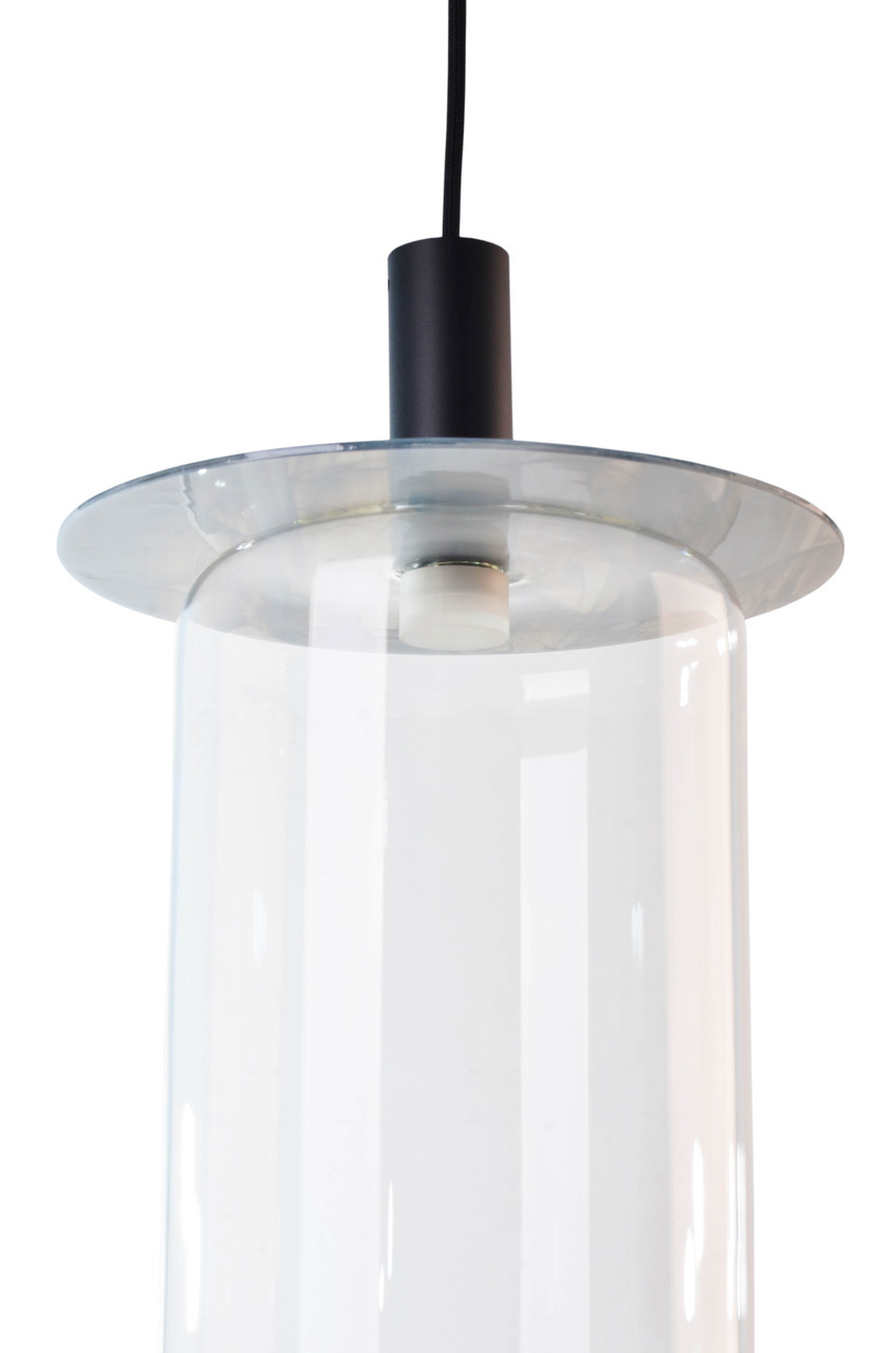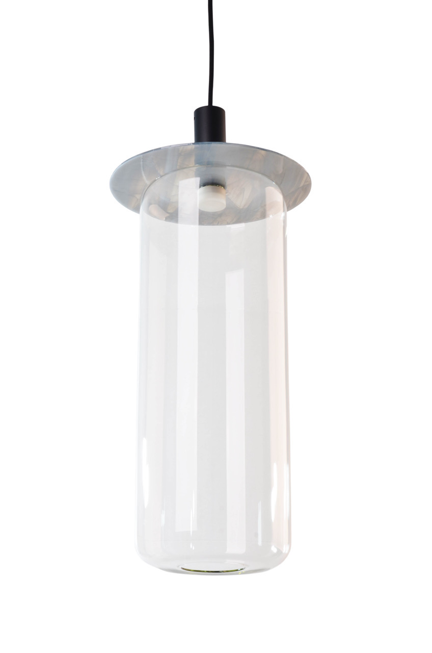 STYLL, minimally adorned with the focus on the shape, as well as the clarity associated with Czech glass blowing. The Cylinder is topped with a hand-blown, swirled glass plate. Hardware and canopy are black.
